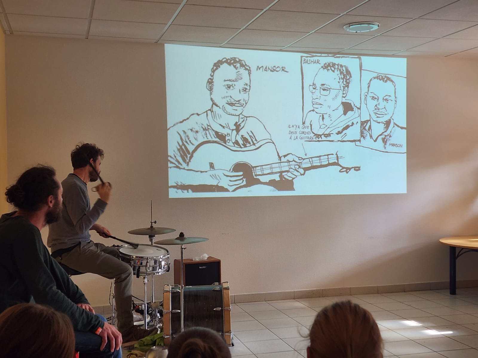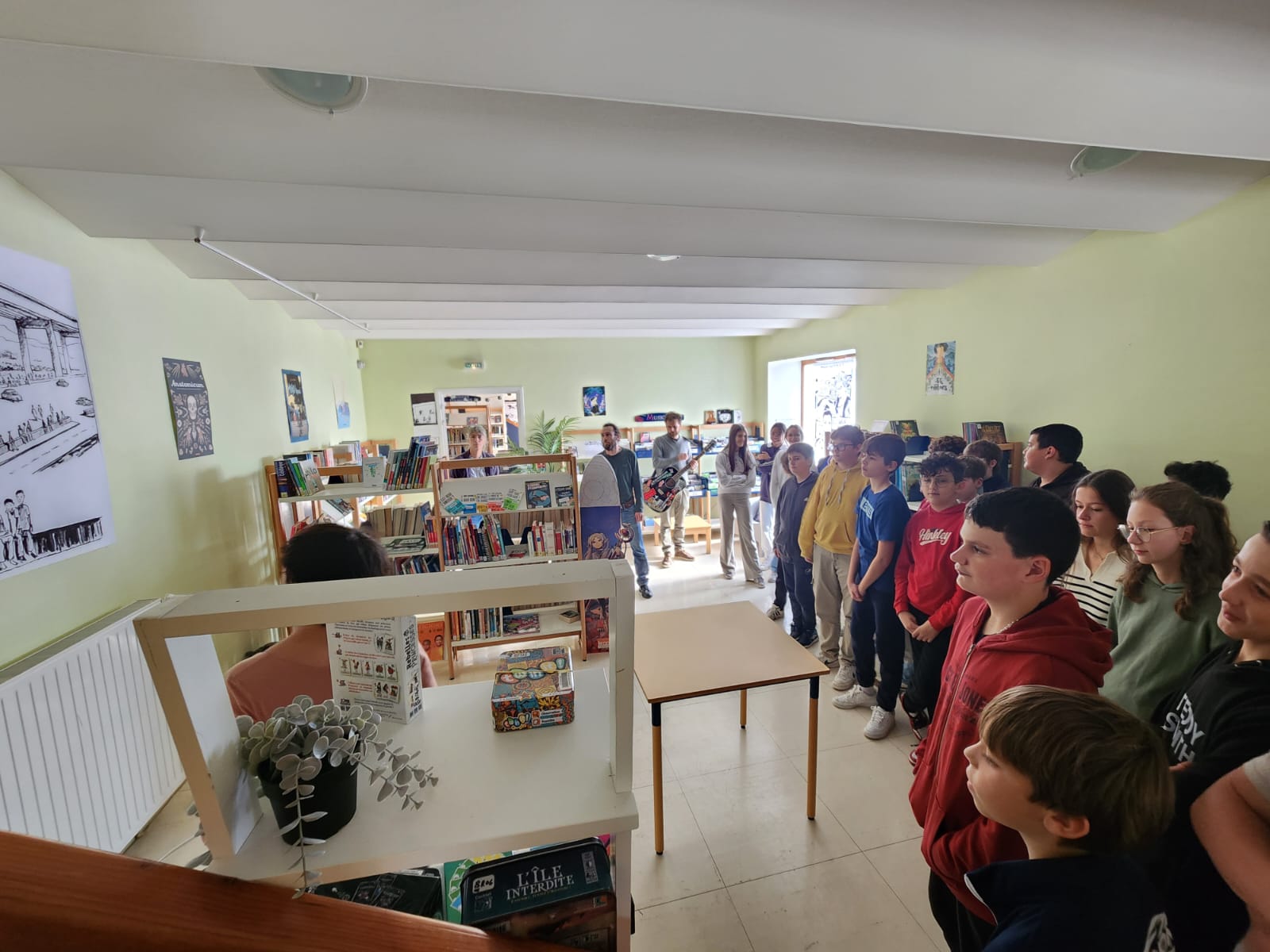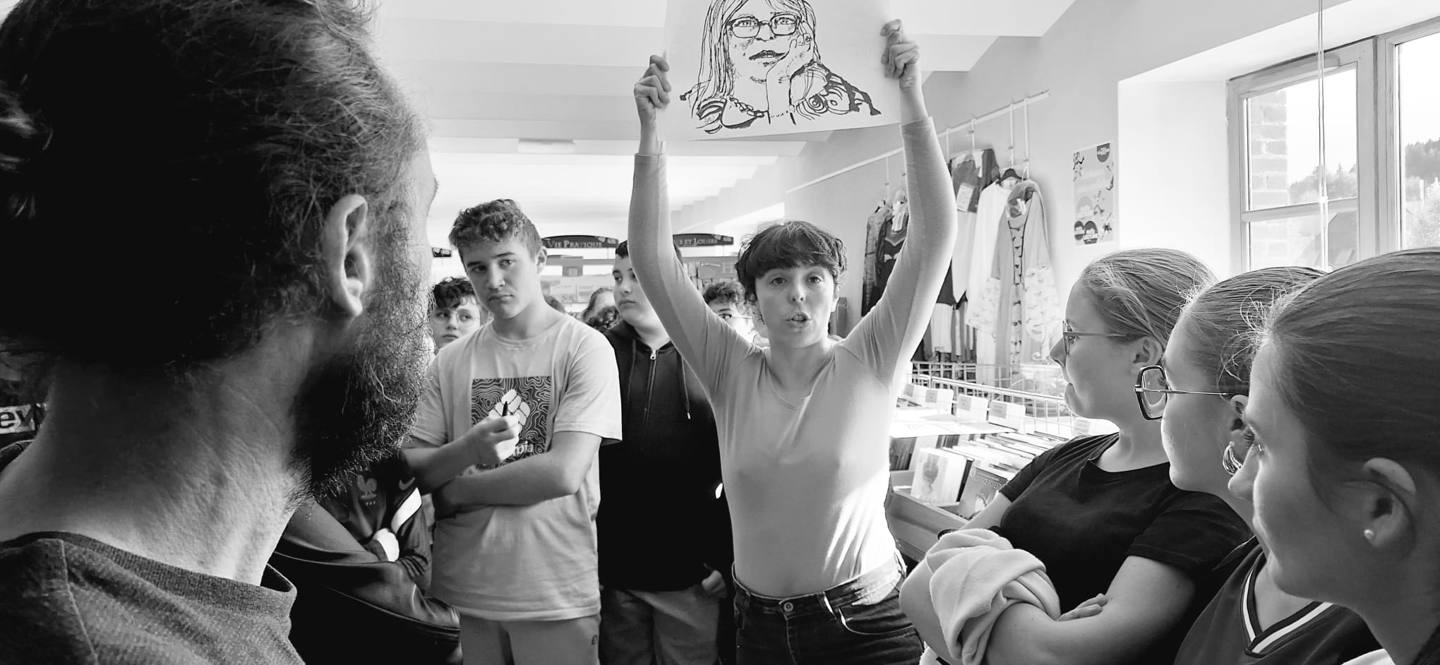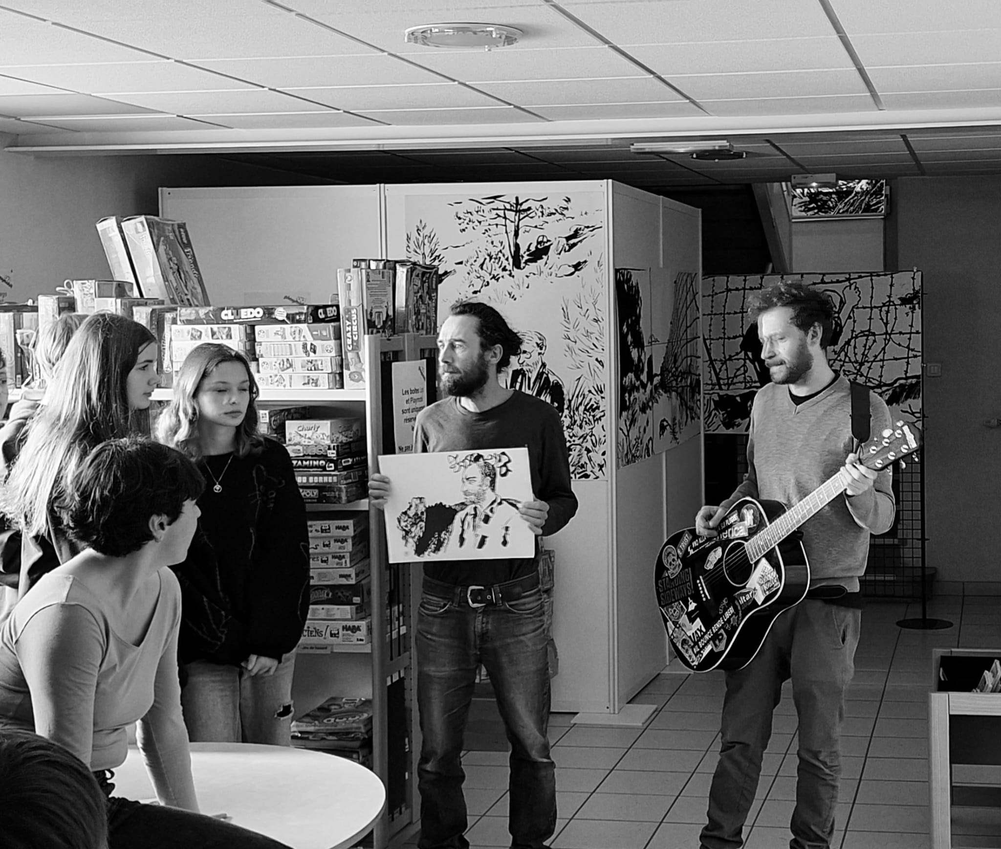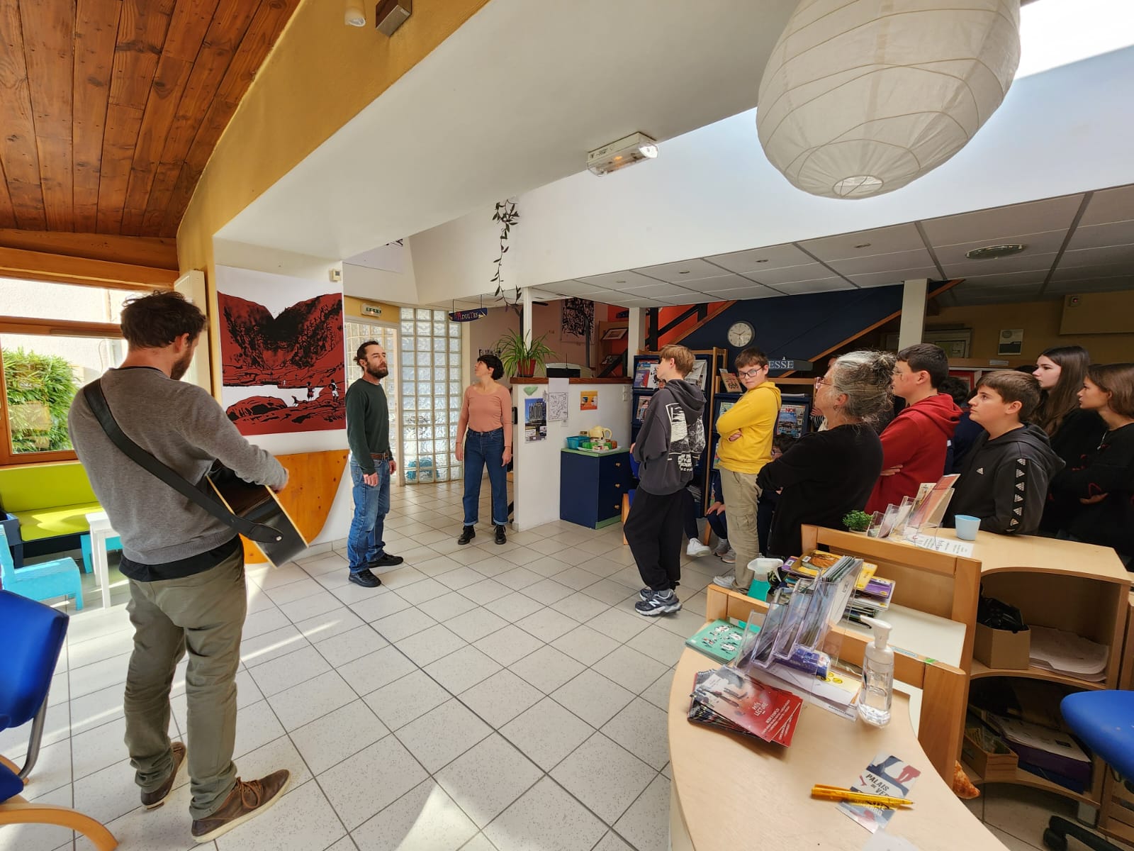 Ce jeudi 7 novembre, les élèves de 4e ont assisté à un spectacle déambulatoire à la médiathèque de Tence : la bande dessinée « humains » qui aborde la migration était au cœur du spectacle. Un bord de scène a ensuite été proposé par les comédiens pour répondre aux questions des élèves.