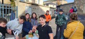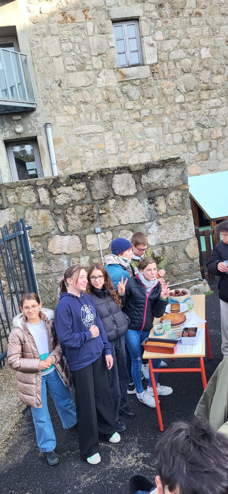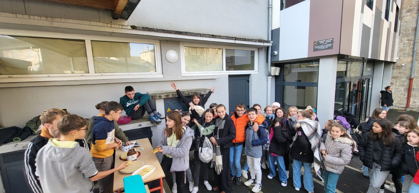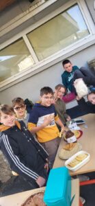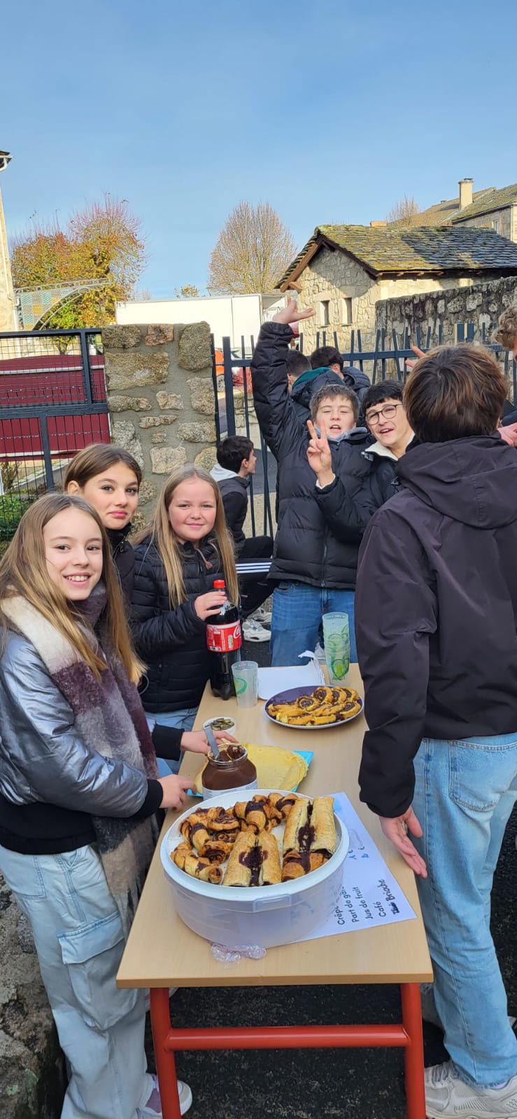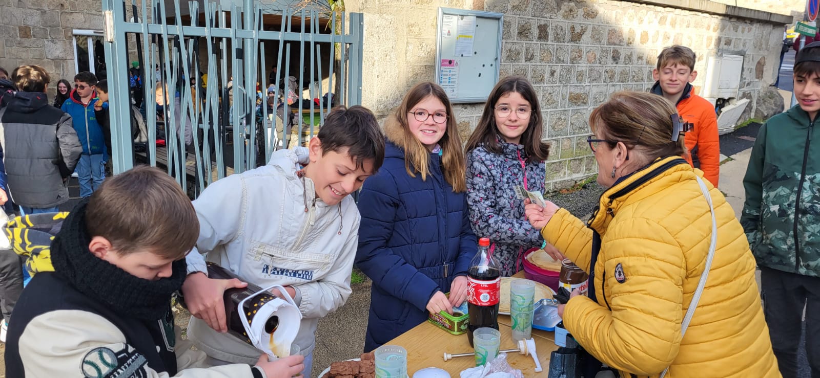 Ce matin les élèves de 5èmes proposent crêpes, cookies et café pour financer leur séjour à la montagne. Une belle manière d’échanger entre les générations.