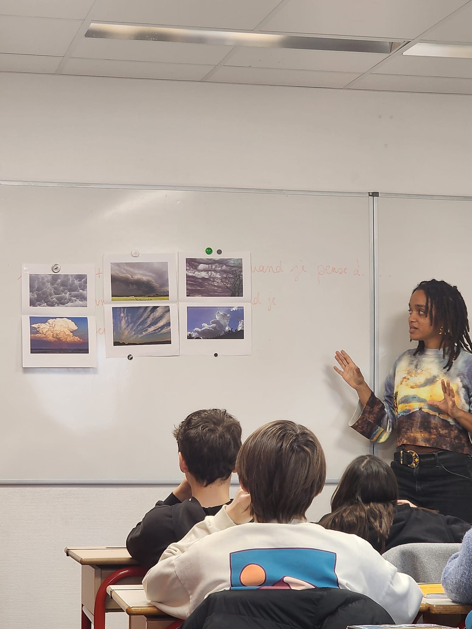 Dans un second temps, les collégiens ont laissé libre cours à leur imagination en inventant un nuage à leur image : couleur, forme, texture, mais aussi pouvoirs extraordinaires, destination ou encore précipitations insolites. Certains nuages faisaient tomber des bonbons, d’autres des souvenirs ou même des éclats de rire.